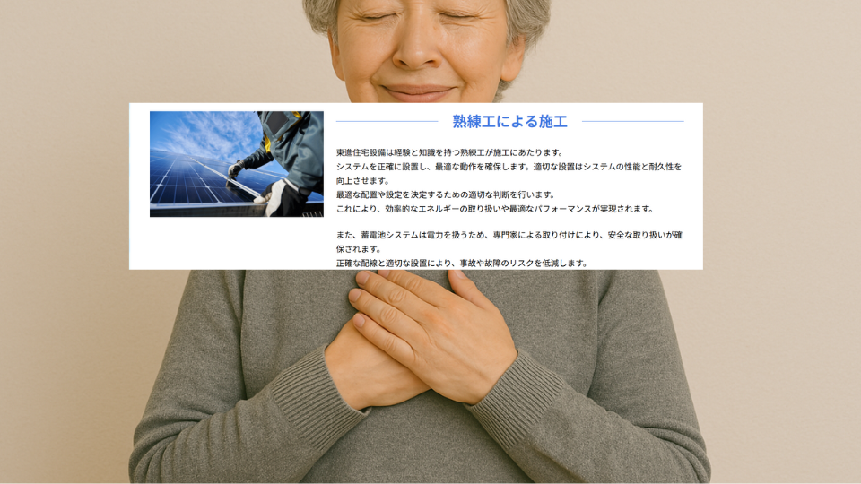 ・補助金申請サポート:蓄電池の導入には、国や地方自治体の補助金が利用できる場合があります。東進住宅設備では、補助金申請のサポートも行っています。